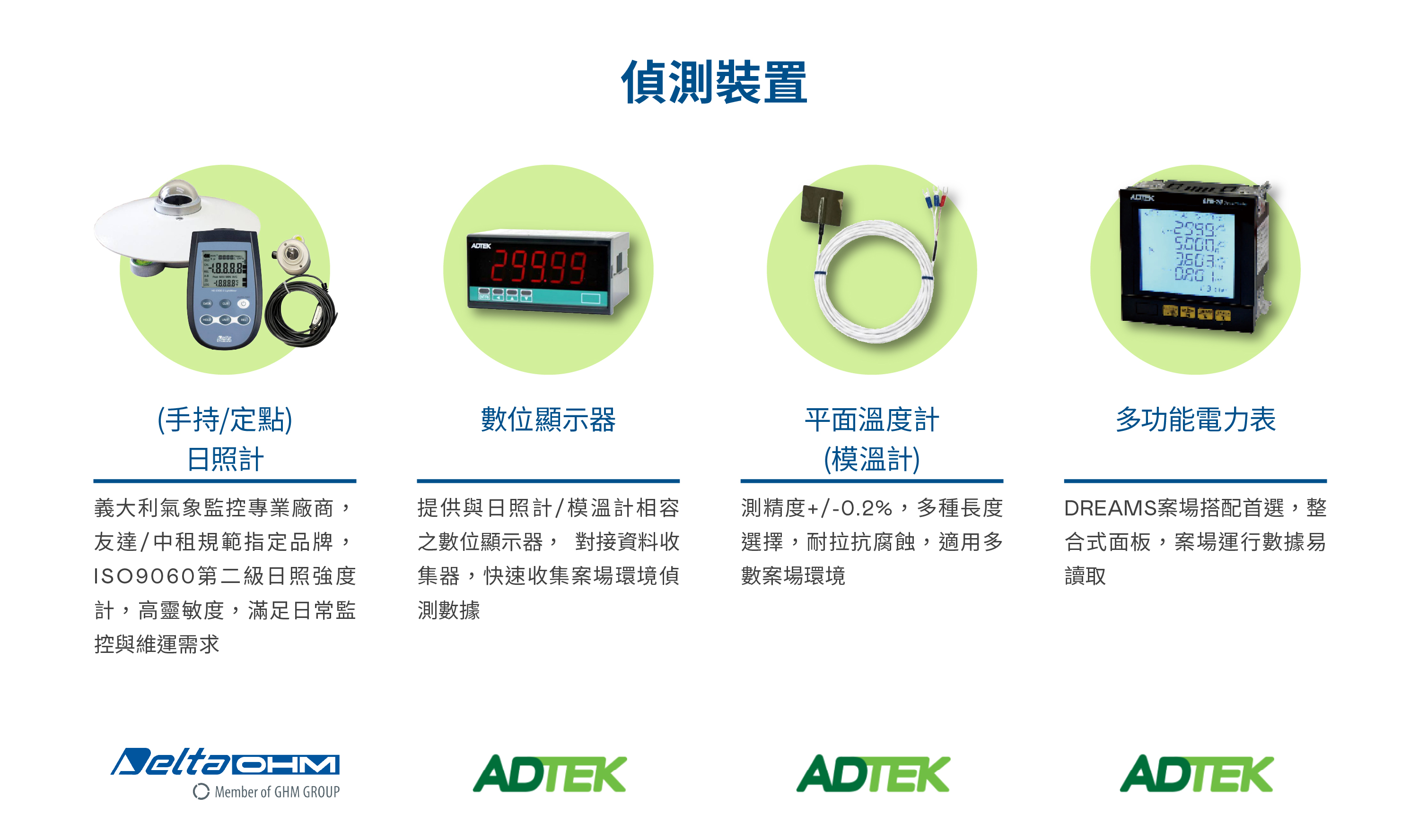 在「一站式購足」服務範疇下,友達除自有太陽能模組及監控監控軟硬體整合方案外, 同時提供客戶太陽能電廠其它的可靠優質零組件品牌與產品,包含電廠的重要組件如變流器、連接器、電線電纜、環境偵測裝置及相關輔佐材料與工具。